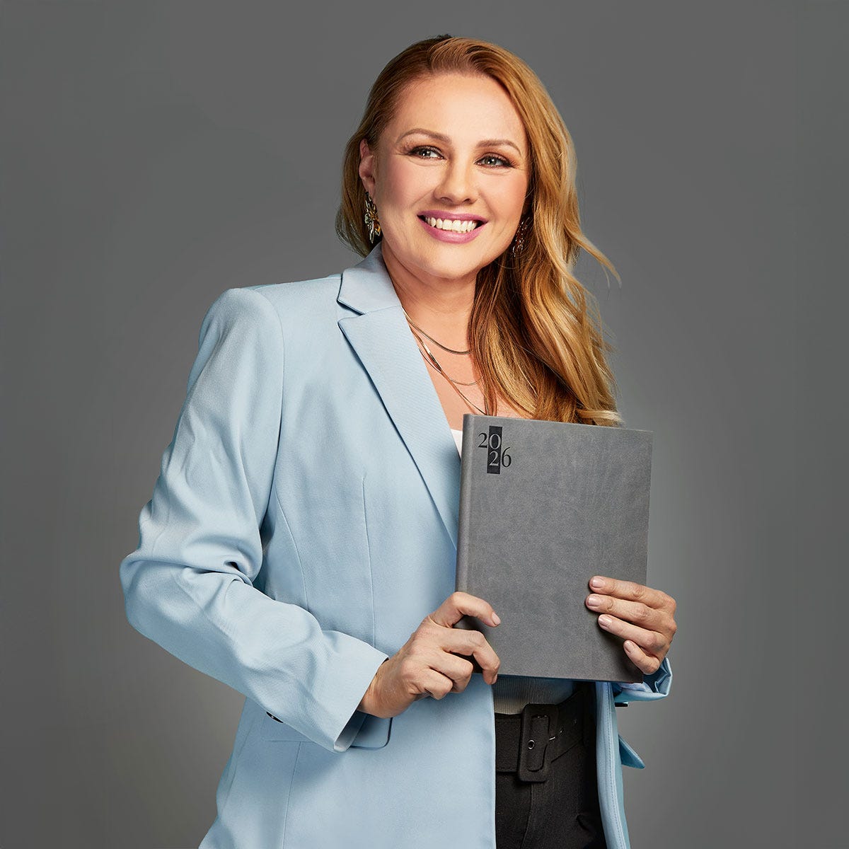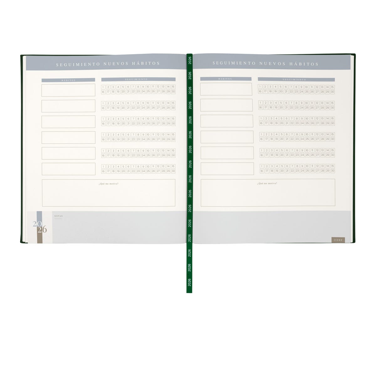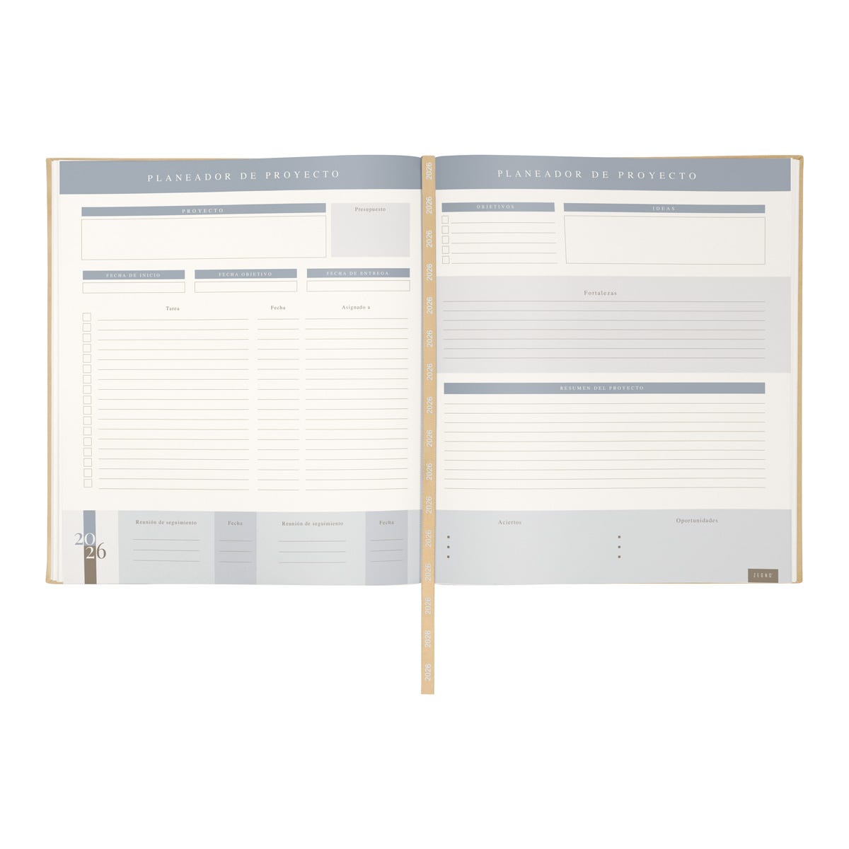Agenda semanal con 80 hojas. Contiene datos personales, calendarios 2025-2026-2027, planeador 2026, presupuesto de gastos, seguimiento de nuevos hábitos, organizador de tareas, planeador de proyecto y días festivos. Incluye caja individual.