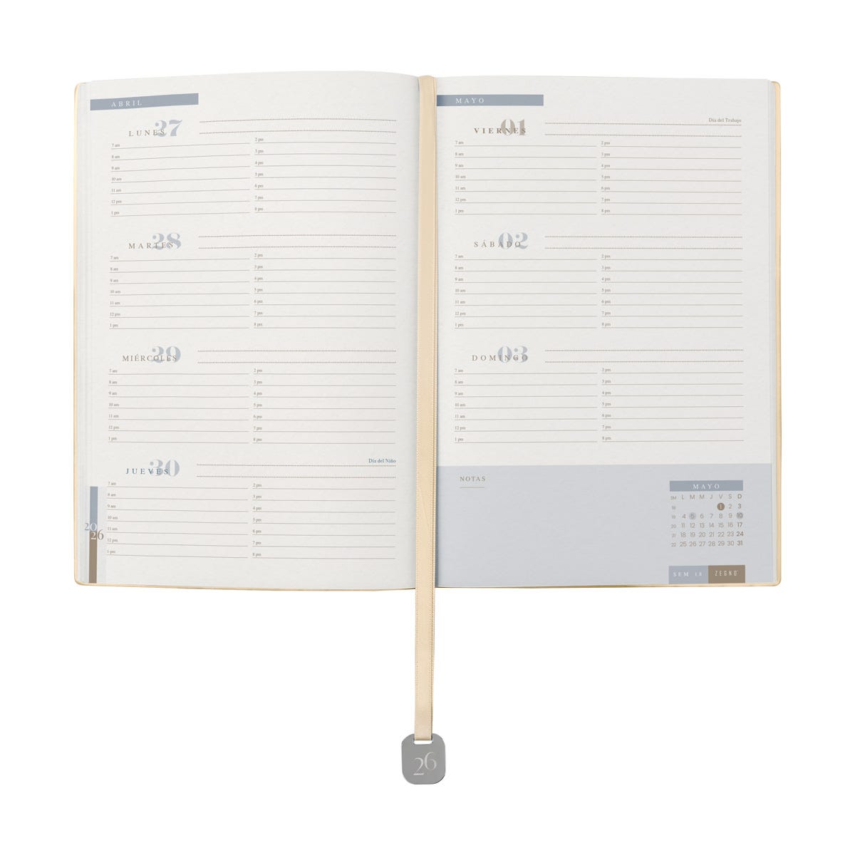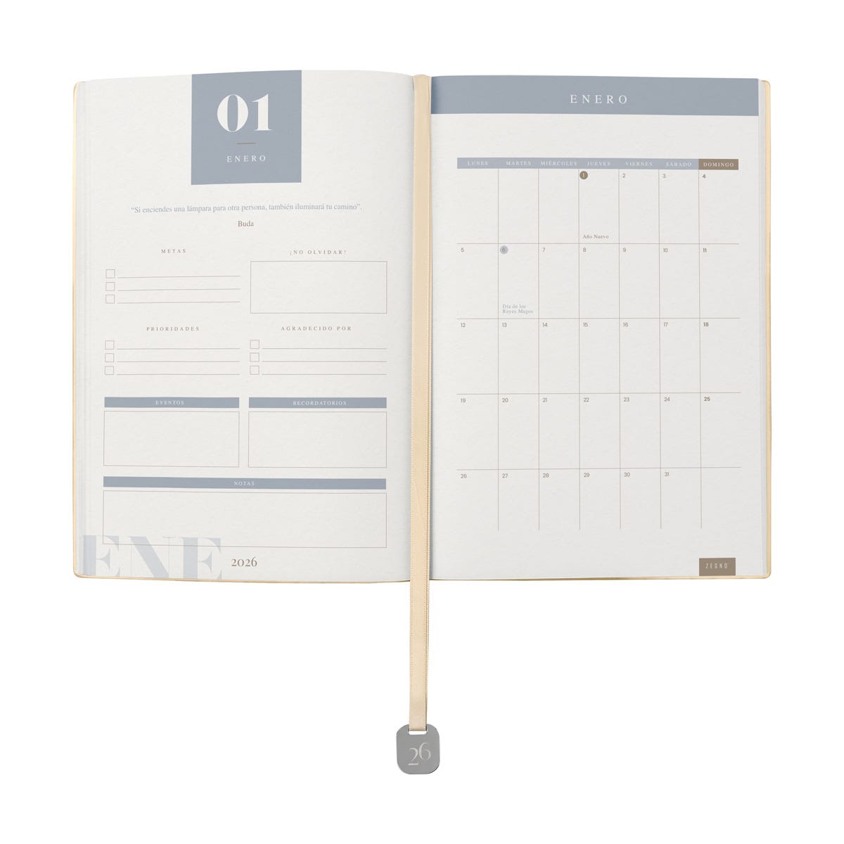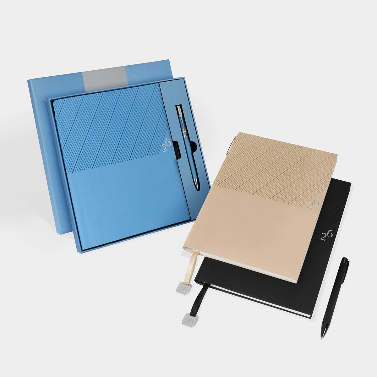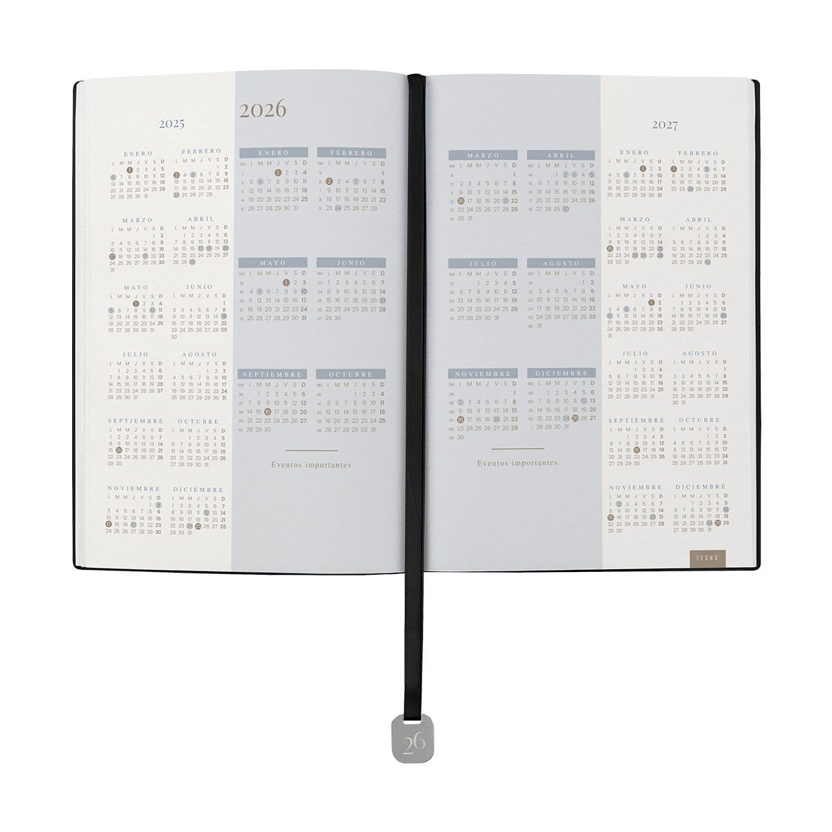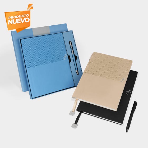 Agenda semanal con 100 hojas. Contiene datos personales, calendarios 2025-2026-2027, planeador 2026, presupuesto de gastos, seguimiento de nuevos hábitos, organizador de tareas, planeador de proyectos y días festivos. Incluye caja individual del mismo color a la agenda, separador con placa metálica y bolígrafo.