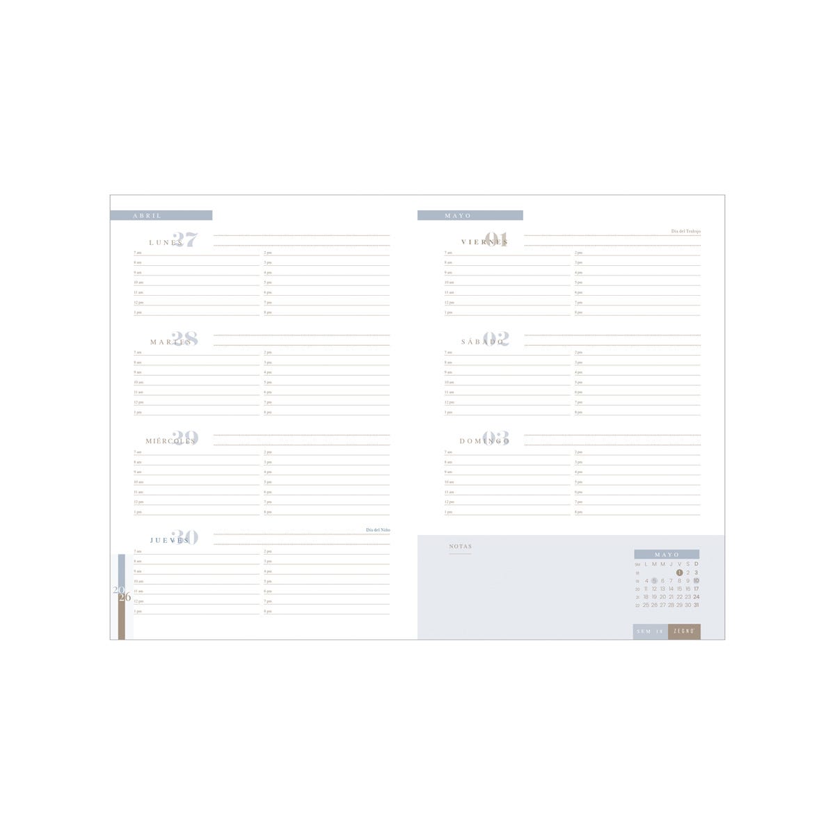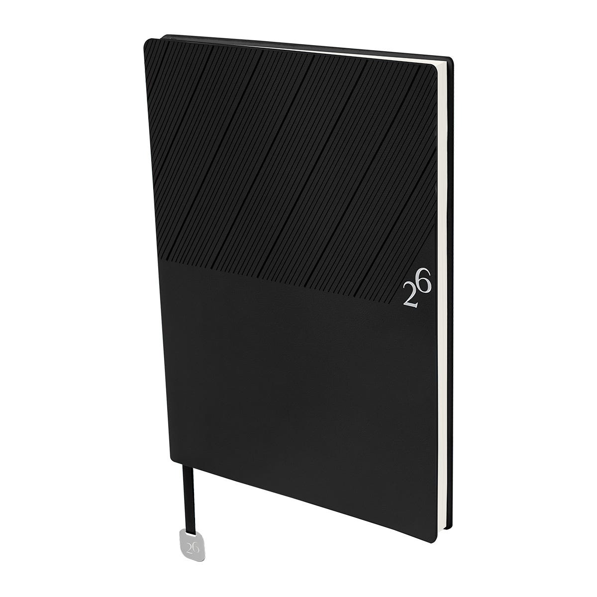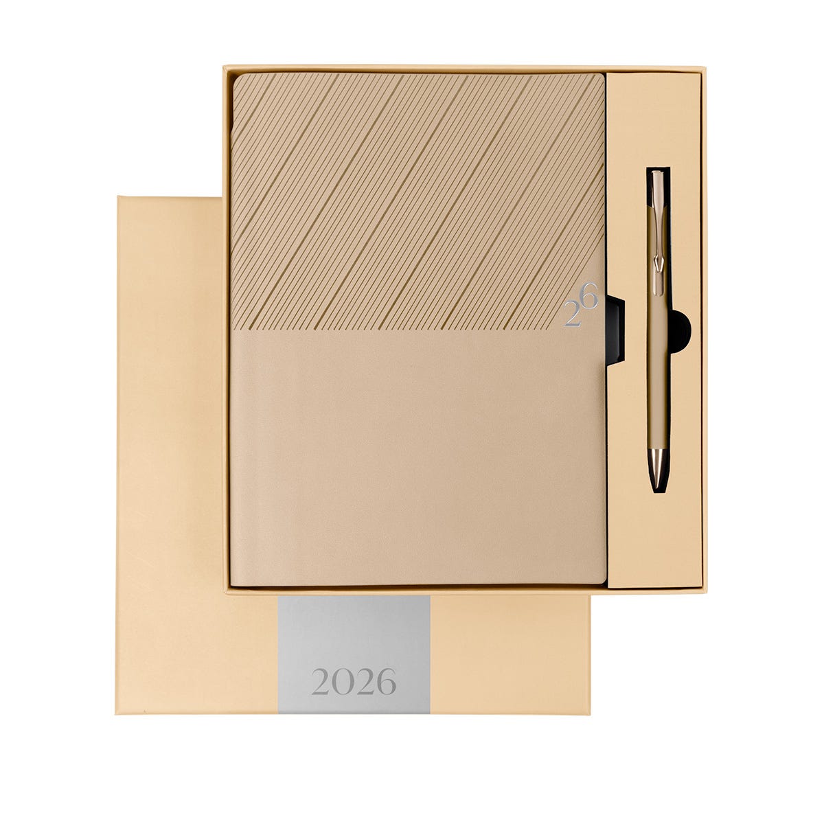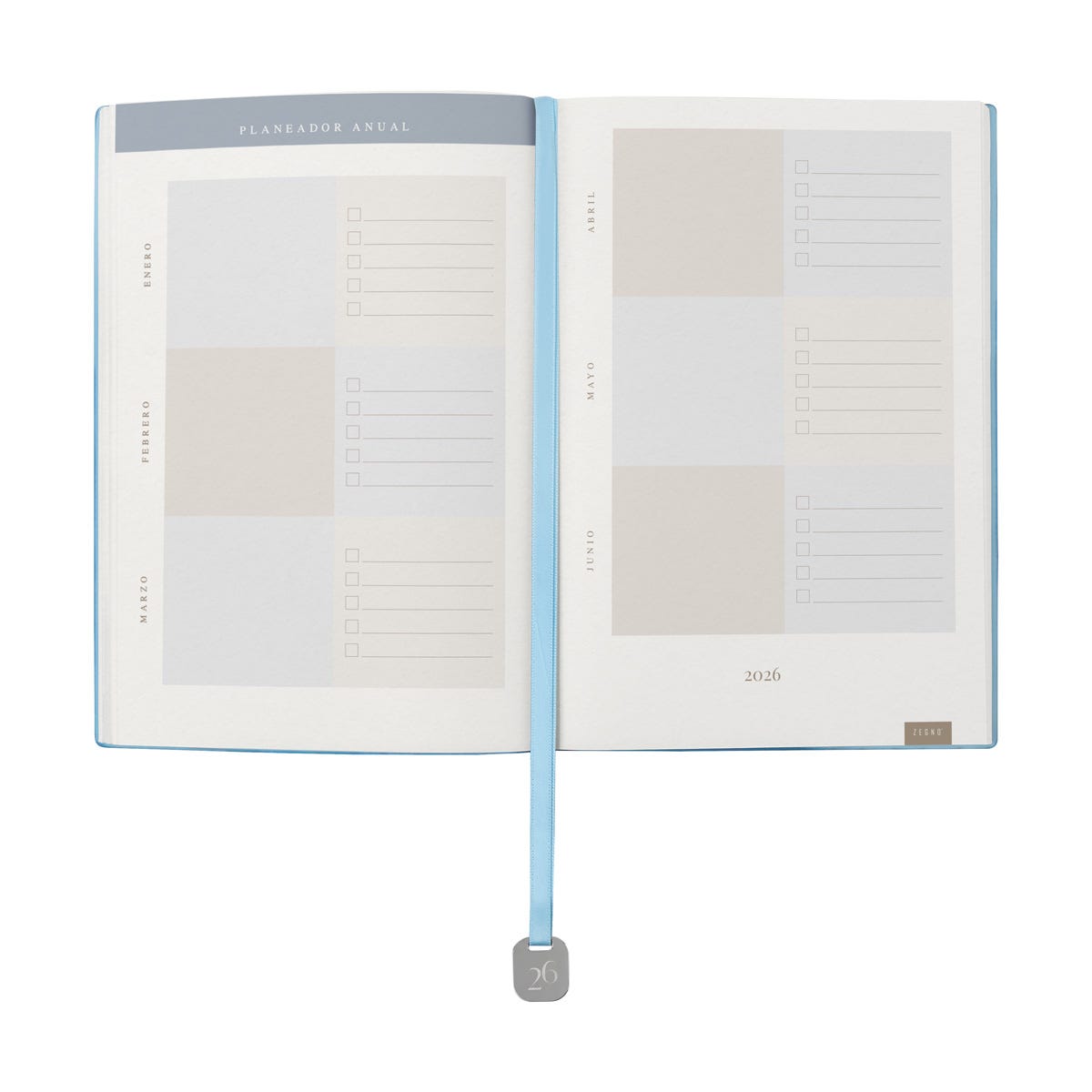 Agenda semanal con 100 hojas. Contiene datos personales, calendarios 2025-2026-2027, planeador 2026, presupuesto de gastos, seguimiento de nuevos hábitos, organizador de tareas, planeador de proyectos y días festivos. Incluye caja individual del mismo color a la agenda, separador con placa metálica y bolígrafo.