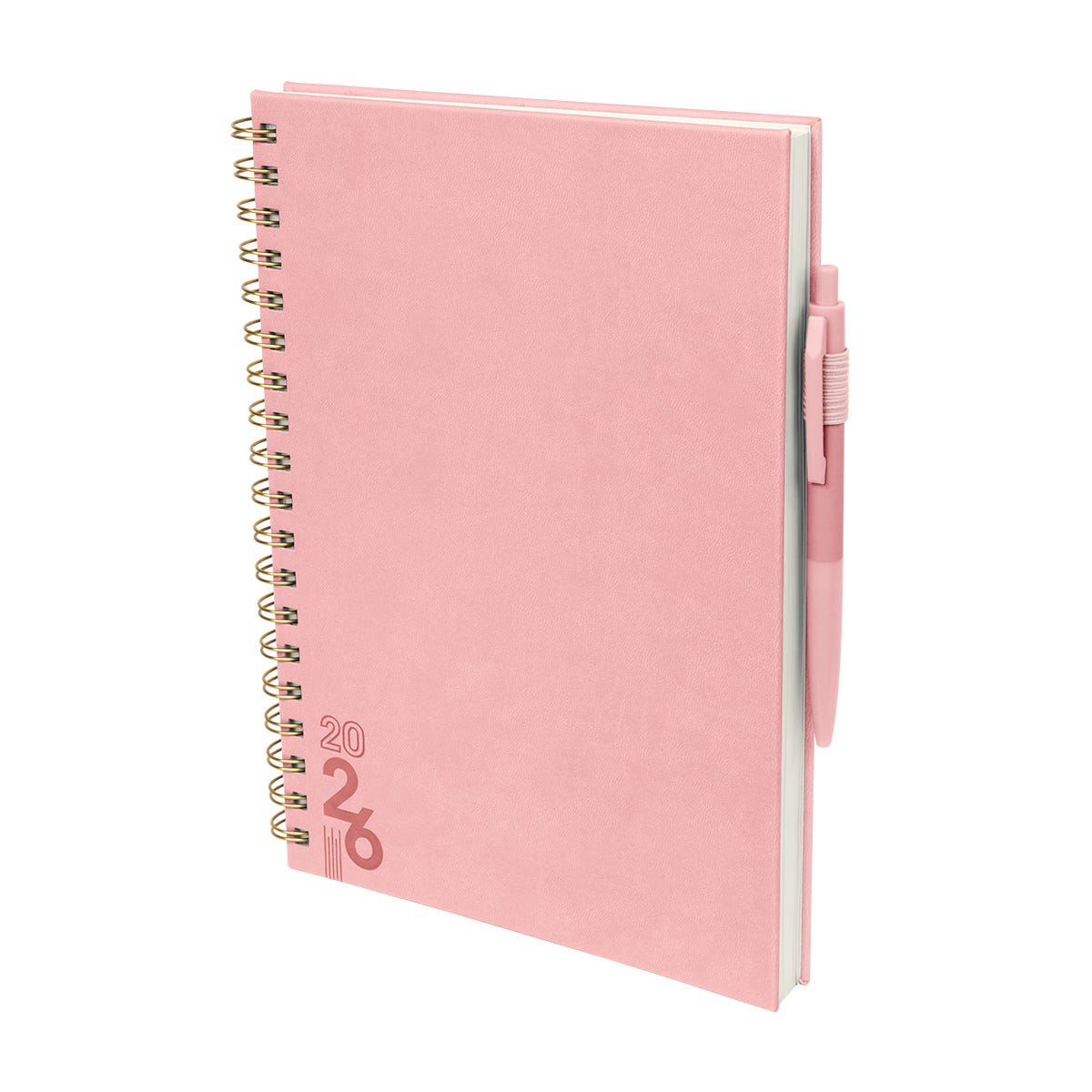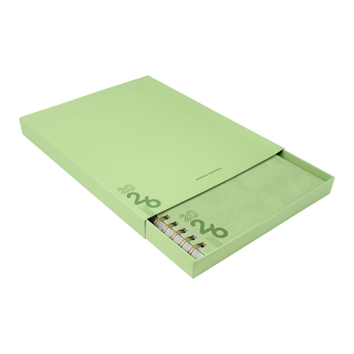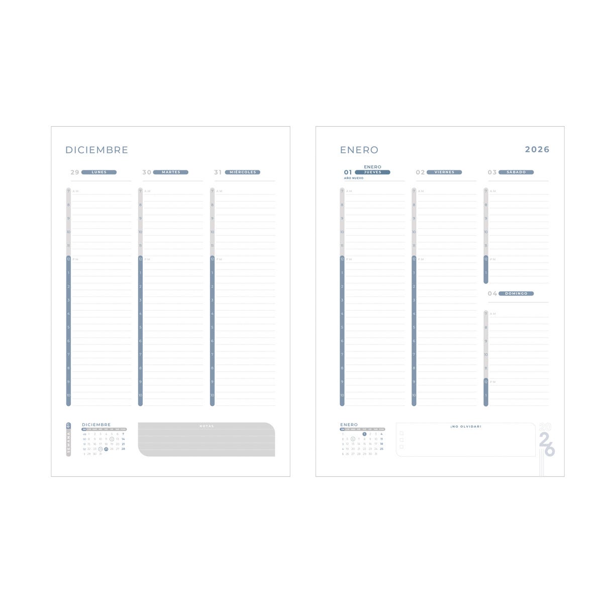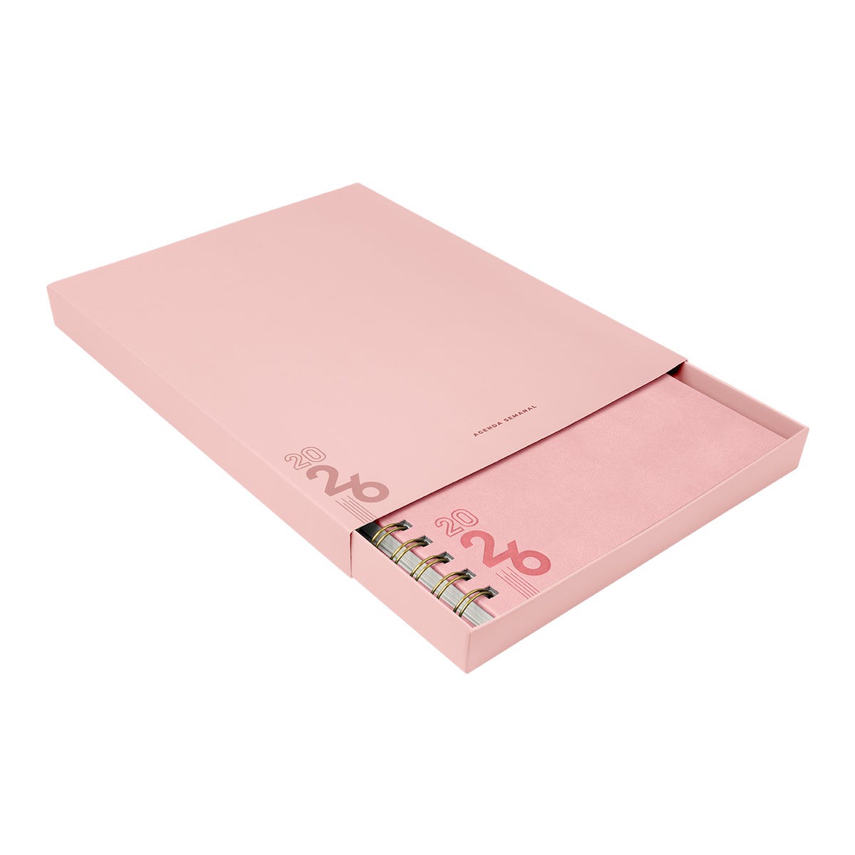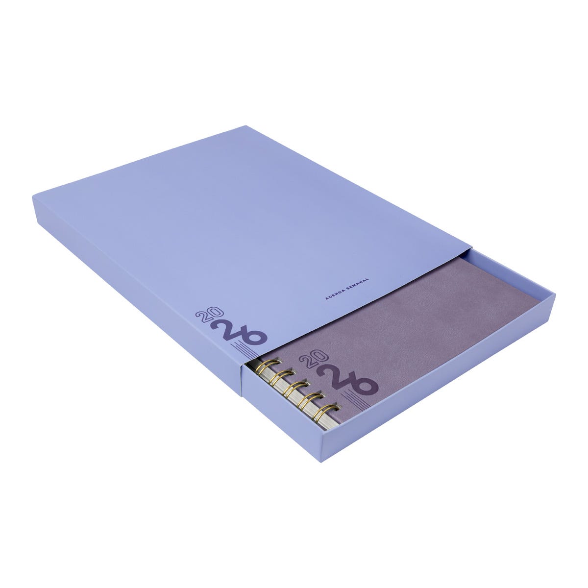 Agenda semanal con 80 hojas. Contiene datos personales, calendarios 2025-2026-2027, planeador 2026, seguimiento de nuevos hábitos, organizador de tareas, planeador de proyectos y días festivos. Incluye caja individual del mismo color a la agenda y bolígrafo.