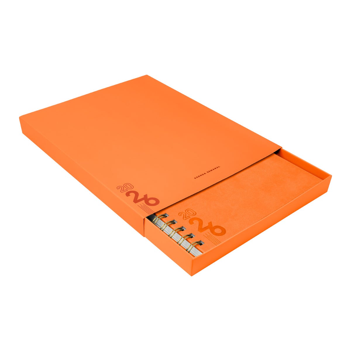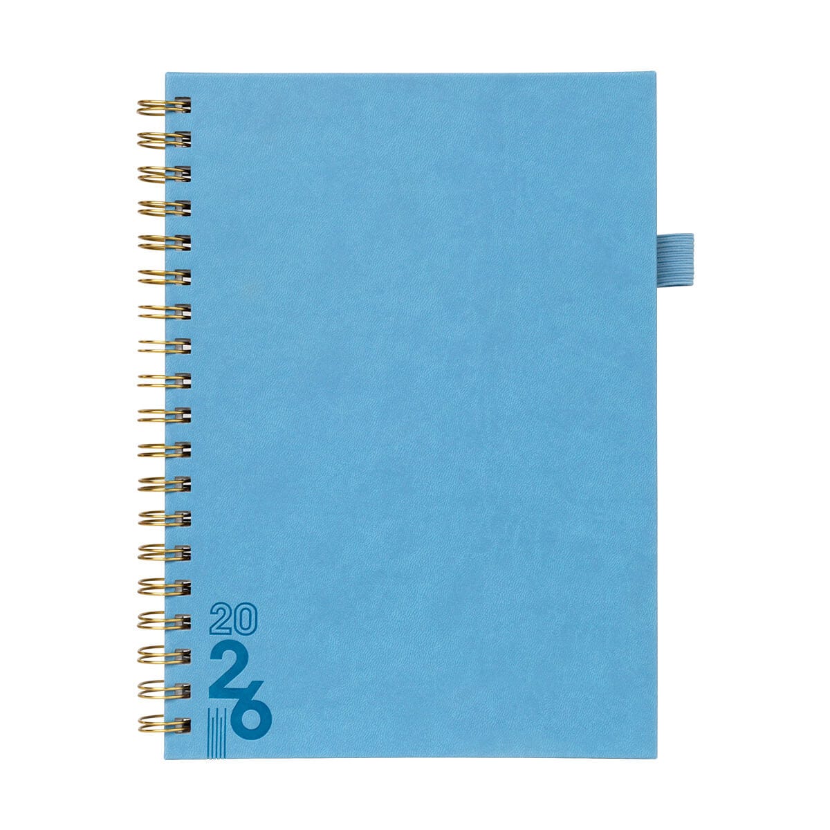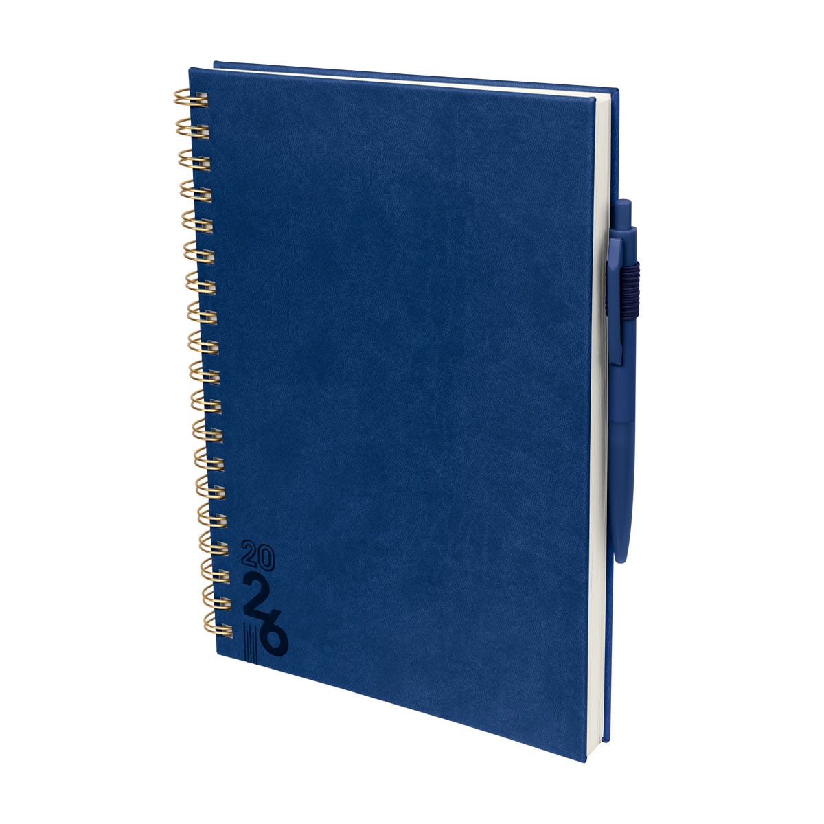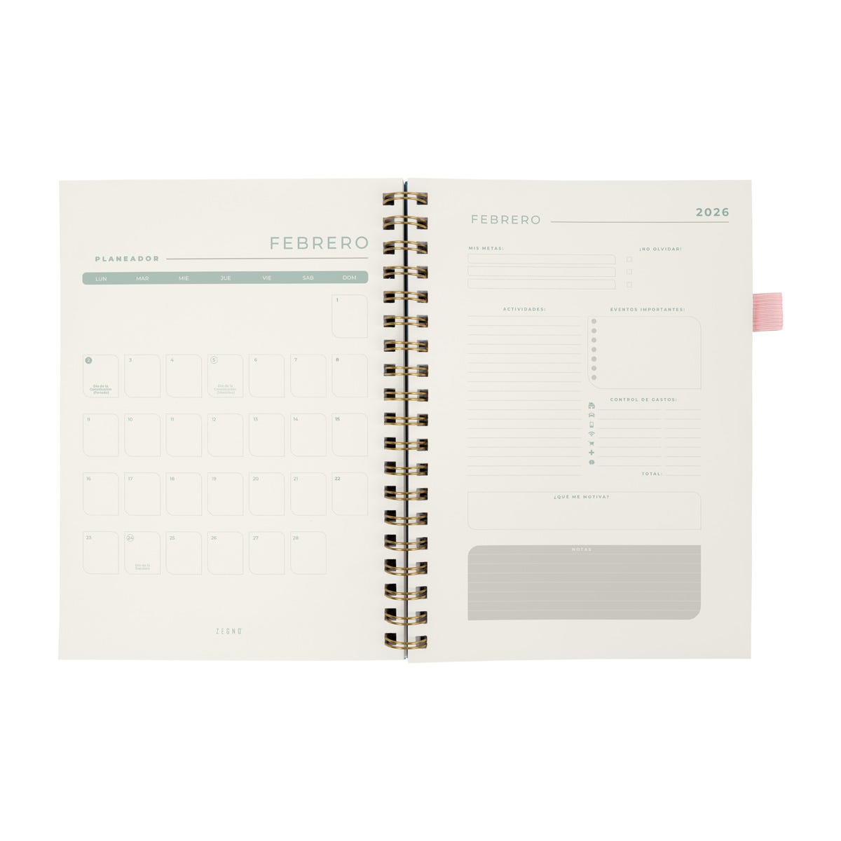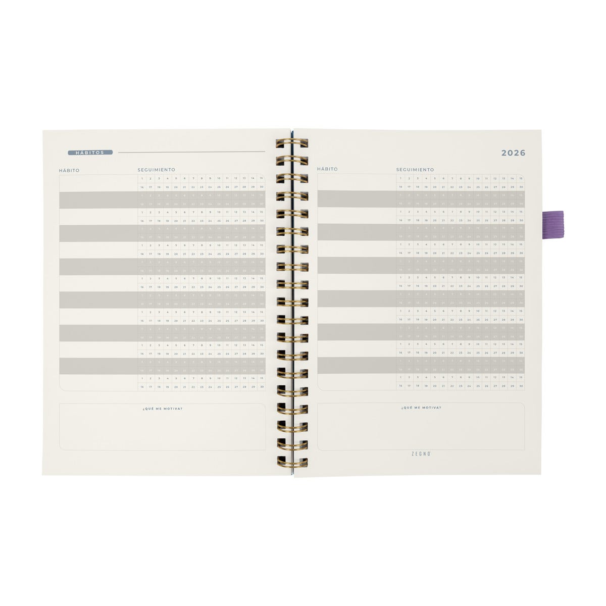 Agenda semanal con 80 hojas. Contiene datos personales, calendarios 2025-2026-2027, planeador 2026, seguimiento de nuevos hábitos, organizador de tareas, planeador de proyectos y días festivos. Incluye caja individual del mismo color a la agenda y bolígrafo.