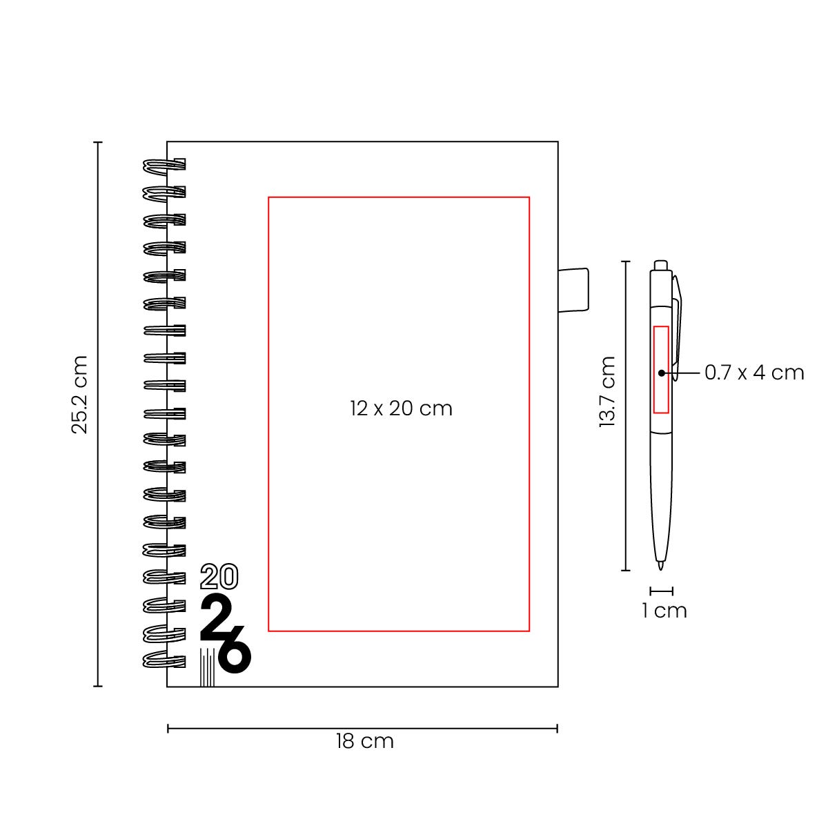 Área 12 x 20 cm Agenda / 0.7 x 4 cm Bolígrafo