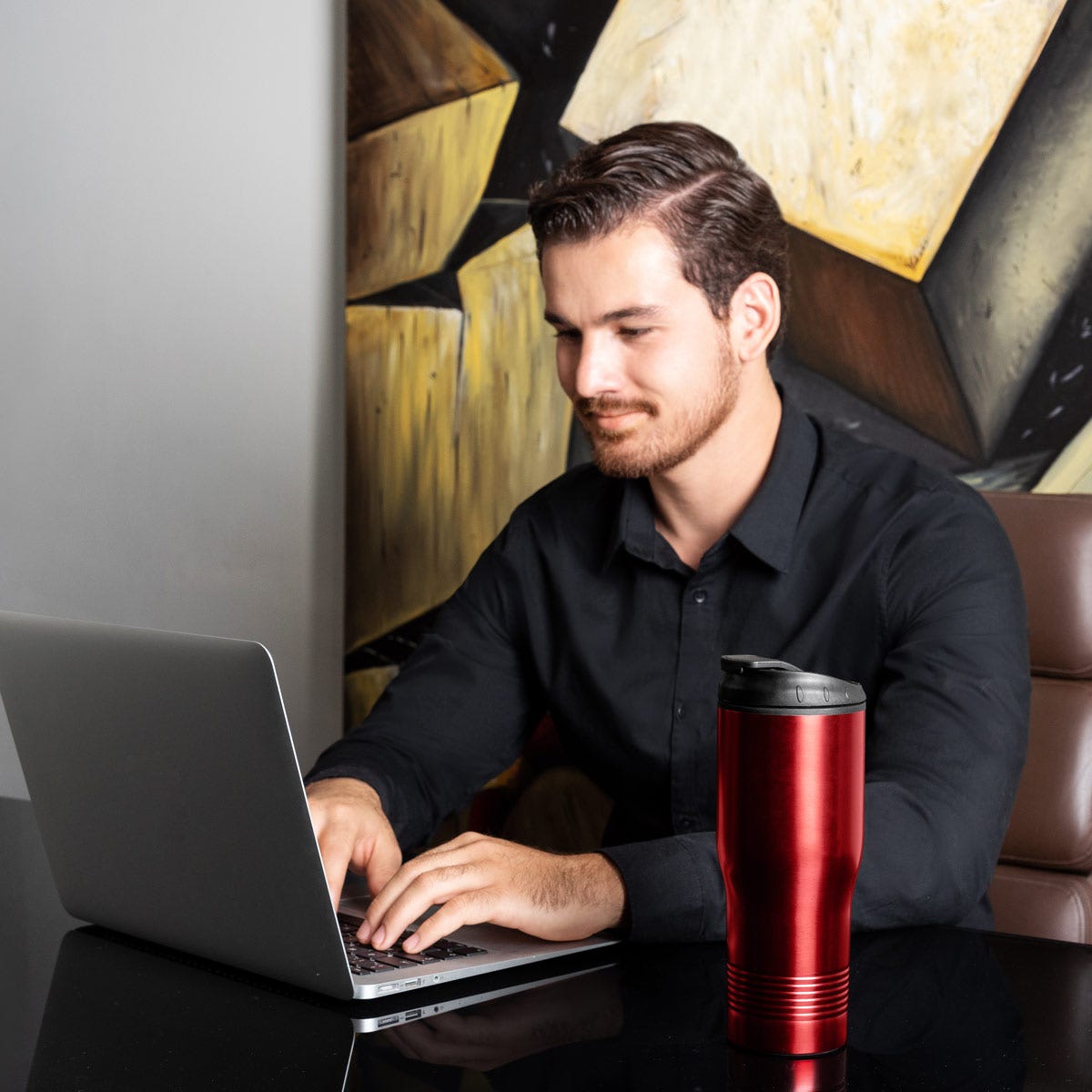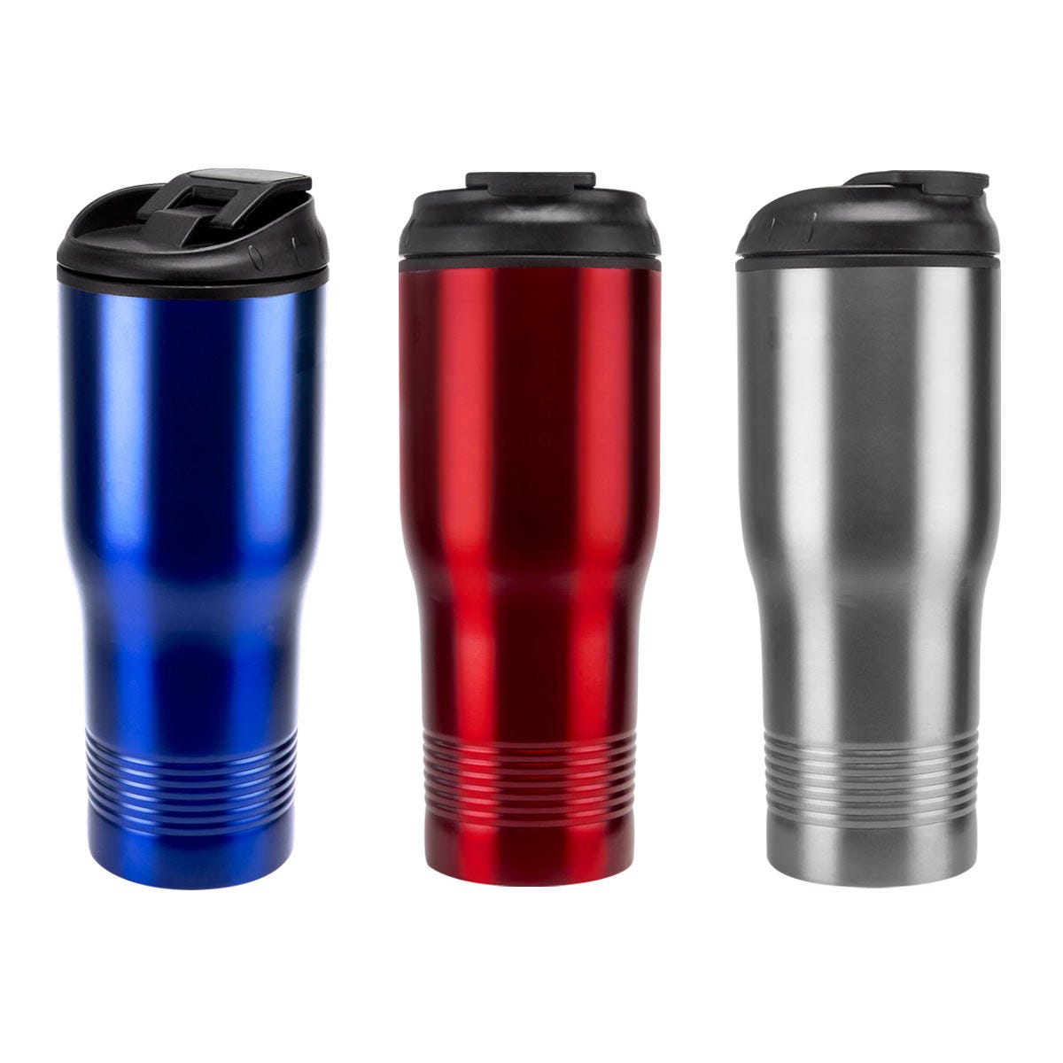 Doble pared. Pared interna plástico, pared externa acero inoxidable. Tapa de plástico con boquilla y sobre tapa de cierre a presión. Incluye caja individual.