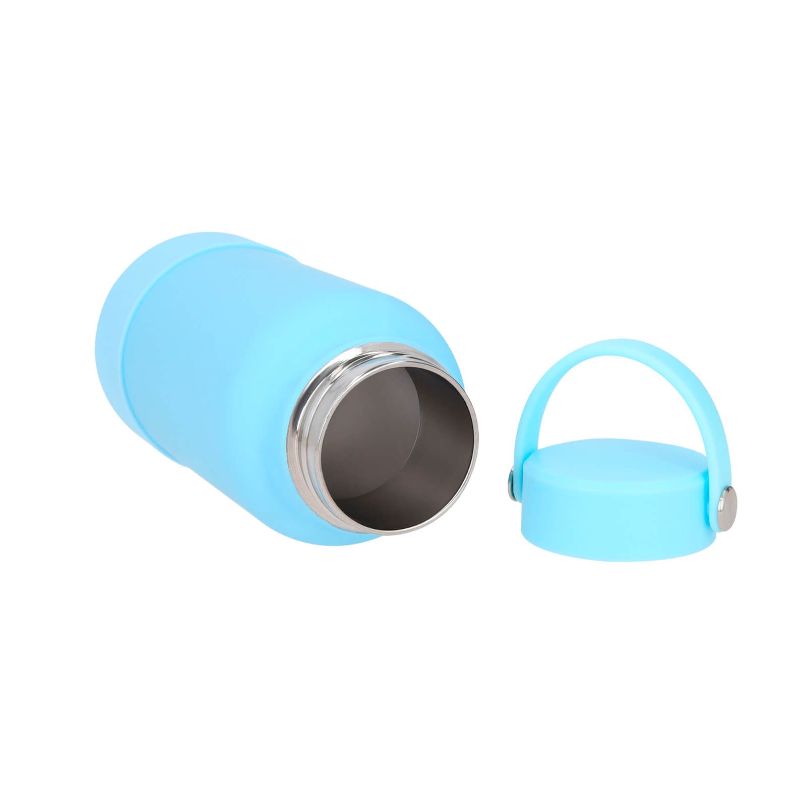 Termo con doble pared de acero inoxidable, insulado al vacío, acabado rubber con silicón en la parte inferior y tapa enroscable con asa.