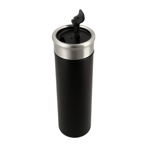 Termo de doble pared con interior de plástico y tapa enroscable a presión.