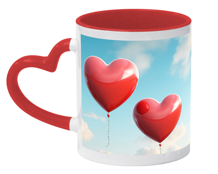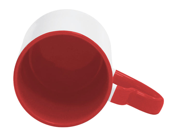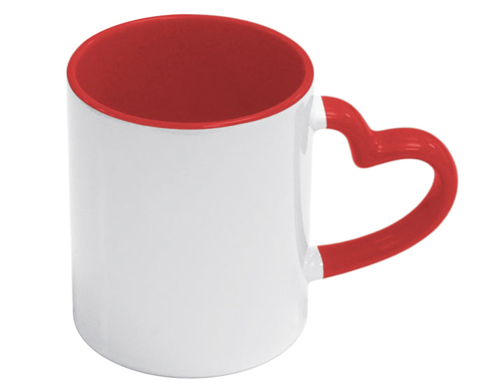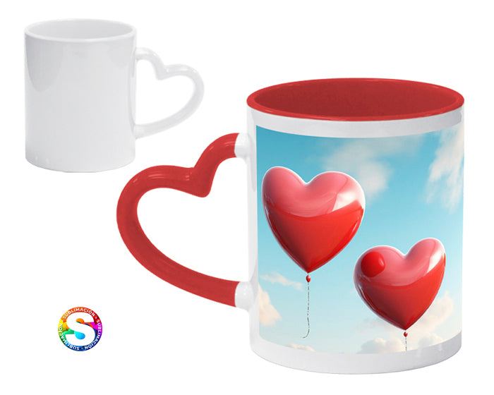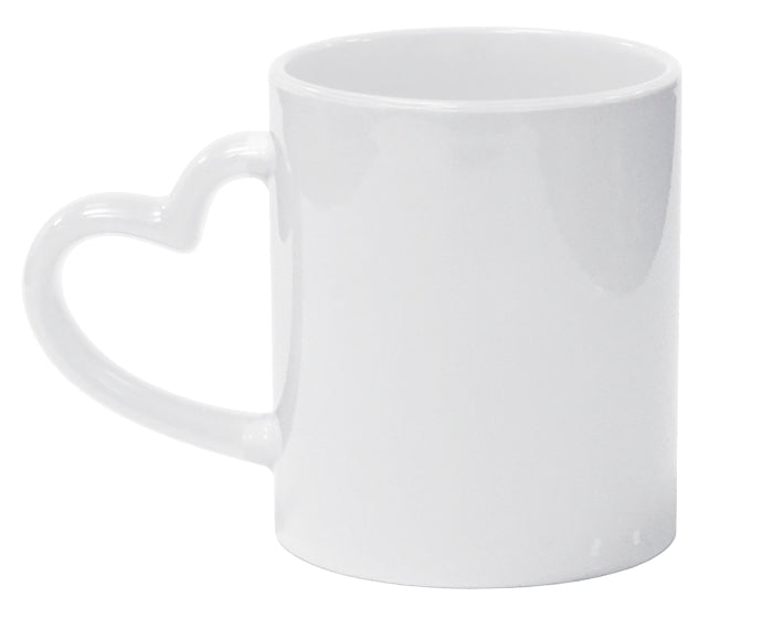 Tarro de sublimación de cerámica blanco con asa en forma de corazón. El interior y el asa son del mismo color. CAP. 325 ml. (11 OZ). Venta en múltiplos de 12.