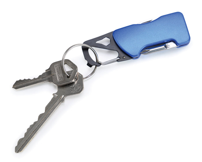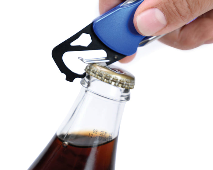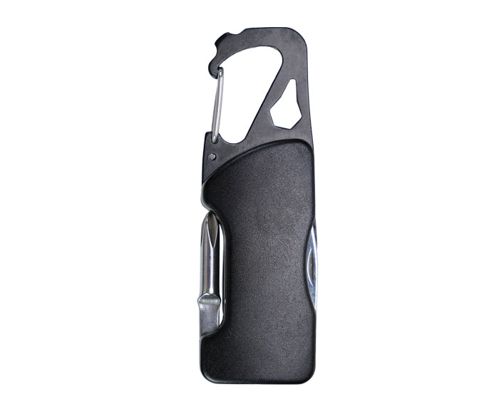 Gancho con clip multifunción que incluye: Luz LED con botón de encendido/apagado, navaja, destapador, llave allen, mini desarmador plano y desarmador de cruz. Incluye 2 baterías de botón. Presentación: caja individual de kraft.
