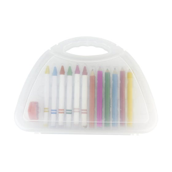 Estuche con 1 sacapuntas, 6 crayones y 6 colores.