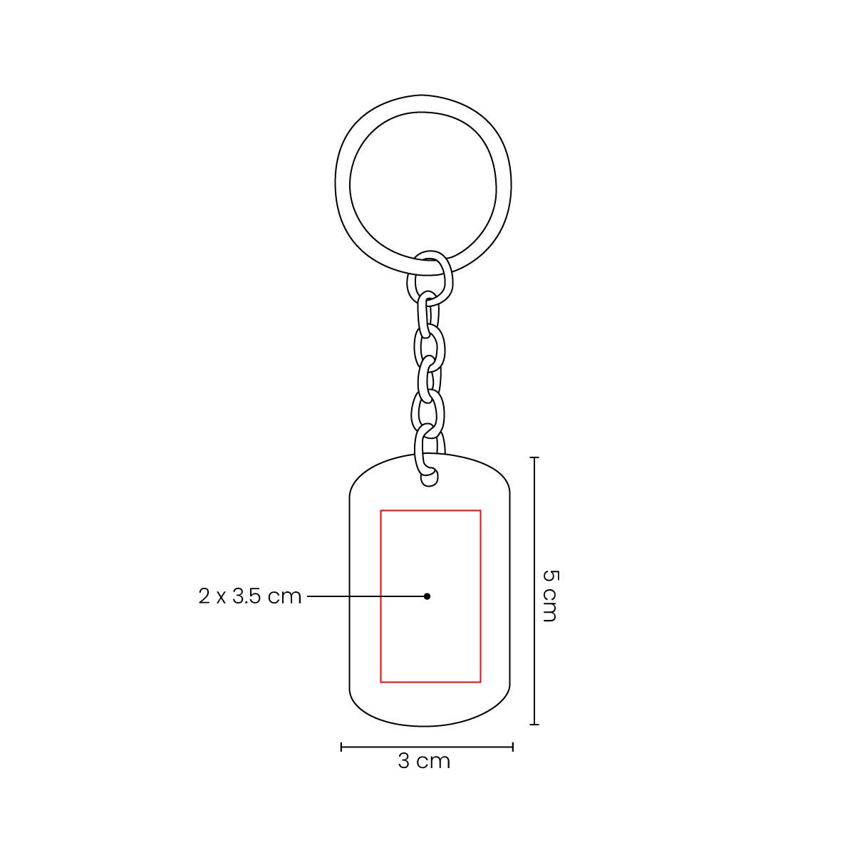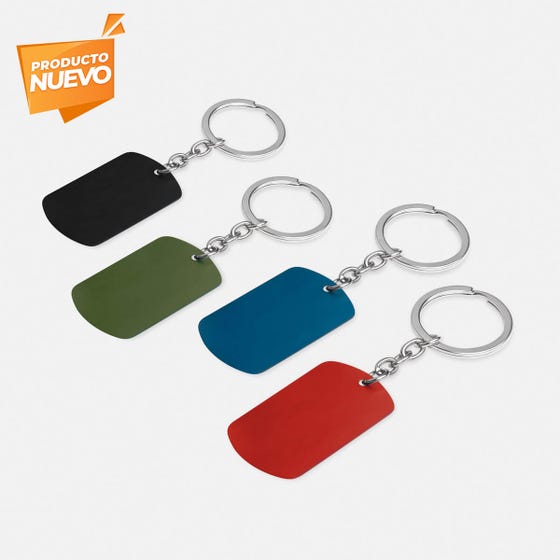 Llavero con placa metálica tipo militar. Diseño ligero, delgado y con acabado satinado.