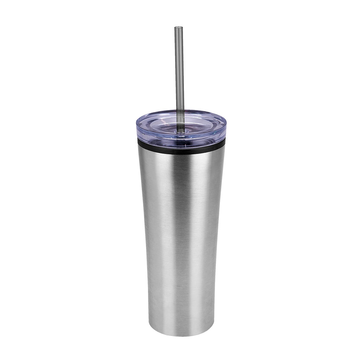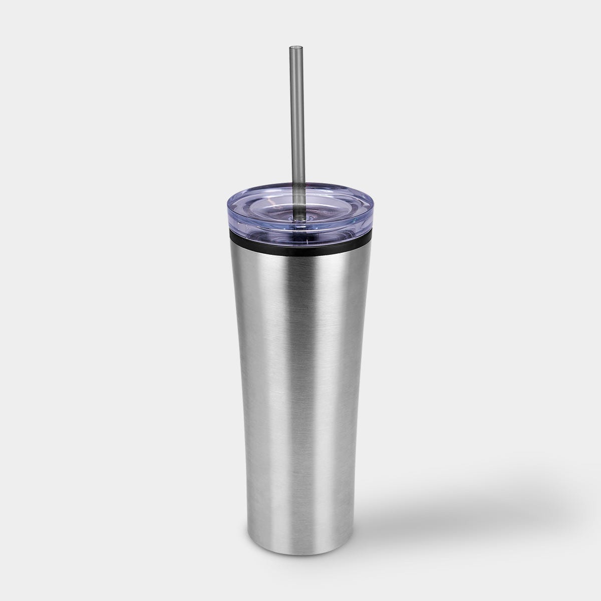 Doble pared. Pared interna plástico, pared externa acero inoxidable. Tapa y popote de plástico. Incluye caja individual.