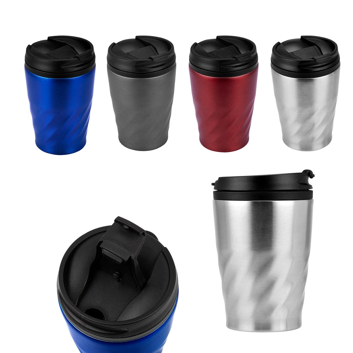 Doble pared. Pared interna plástico, pared externa acero inoxidable. Tapa de plástico con válvula de seguridad. Incluye caja individual.