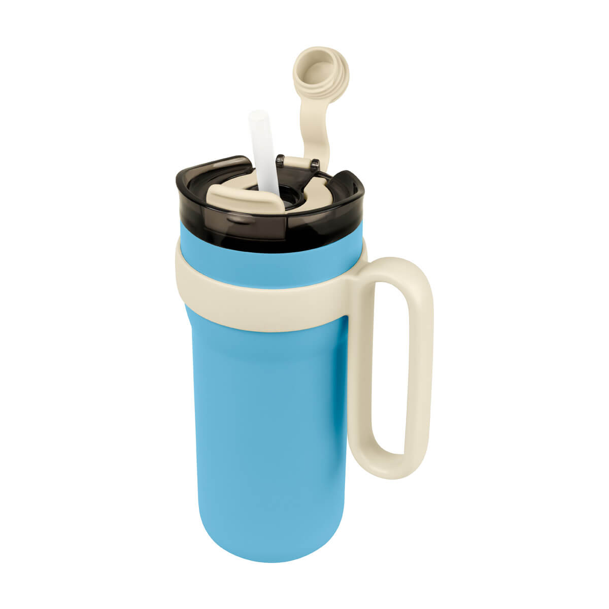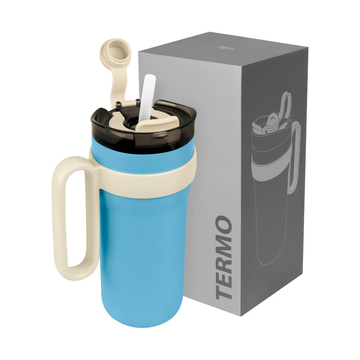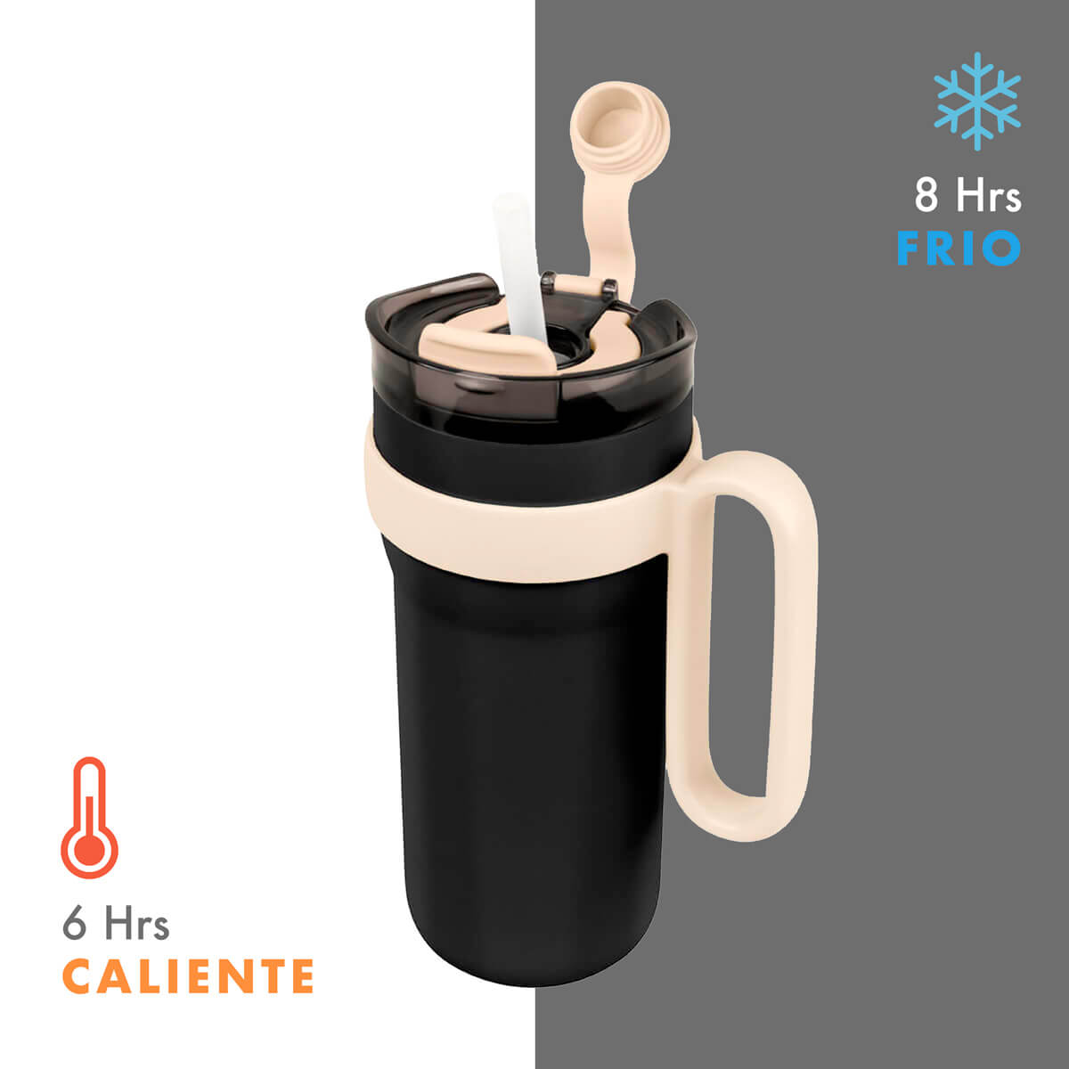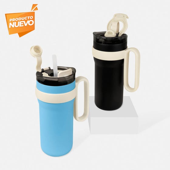 Termo doble pared. Cerrado al vacío. Pared interna y externa de acero inoxidable. Cuerpo con terminado rugoso. Incluye tapa con cierre de rosca que ofrece dos alternativas de uso, sobretapa con sistema push y ranura especial para popote con aditamento para cerrar y evitar derrames. Incluye popote de plástico que cuenta con un mecanismo de salida automática y una base de silicón, que lo eleva al abrir el compartimento. Además, su original asa permite llevarlo cómodamente a cualquier lugar. Mantiene temperatura caliente 6 hrs y temperatura fría 8 hrs. Capacidad 30 Oz. Base de 8.5 cm de diámetro. Incluye caja individual.