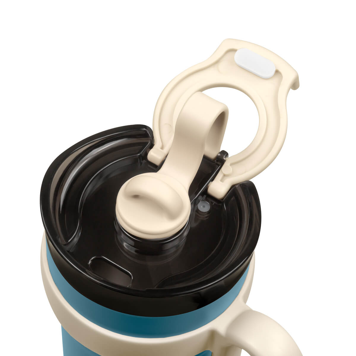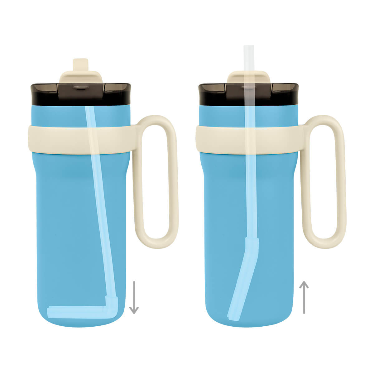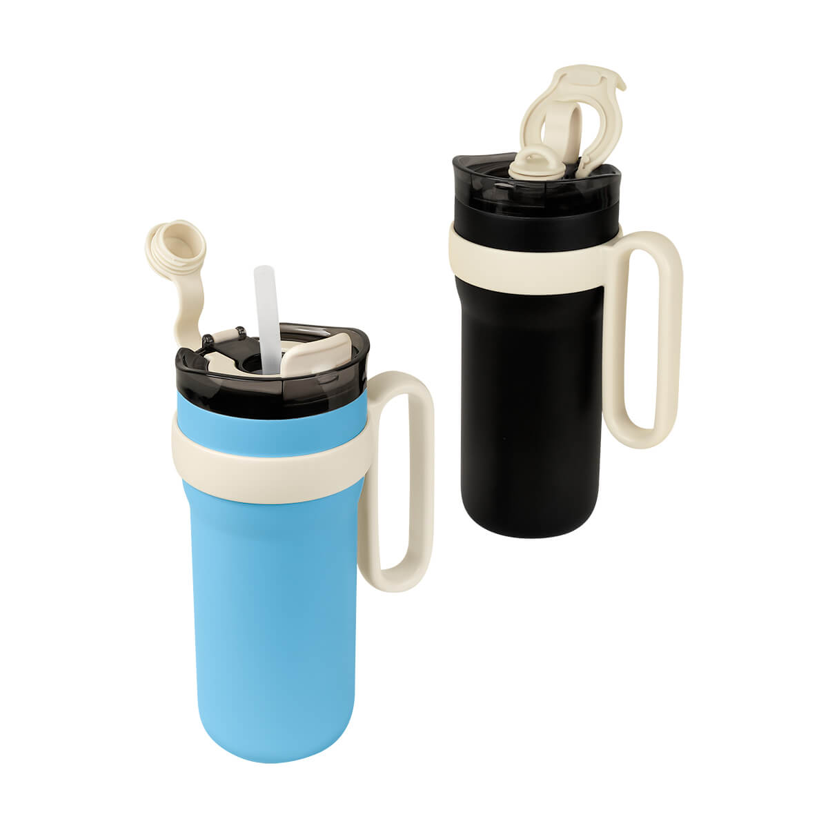 Termo doble pared. Cerrado al vacío. Pared interna y externa de acero inoxidable. Cuerpo con terminado rugoso. Incluye tapa con cierre de rosca que ofrece dos alternativas de uso, sobretapa con sistema push y ranura especial para popote con aditamento para cerrar y evitar derrames. Incluye popote de plástico que cuenta con un mecanismo de salida automática y una base de silicón, que lo eleva al abrir el compartimento. Además, su original asa permite llevarlo cómodamente a cualquier lugar. Mantiene temperatura caliente 6 hrs y temperatura fría 8 hrs. Capacidad 30 Oz. Base de 8.5 cm de diámetro. Incluye caja individual.