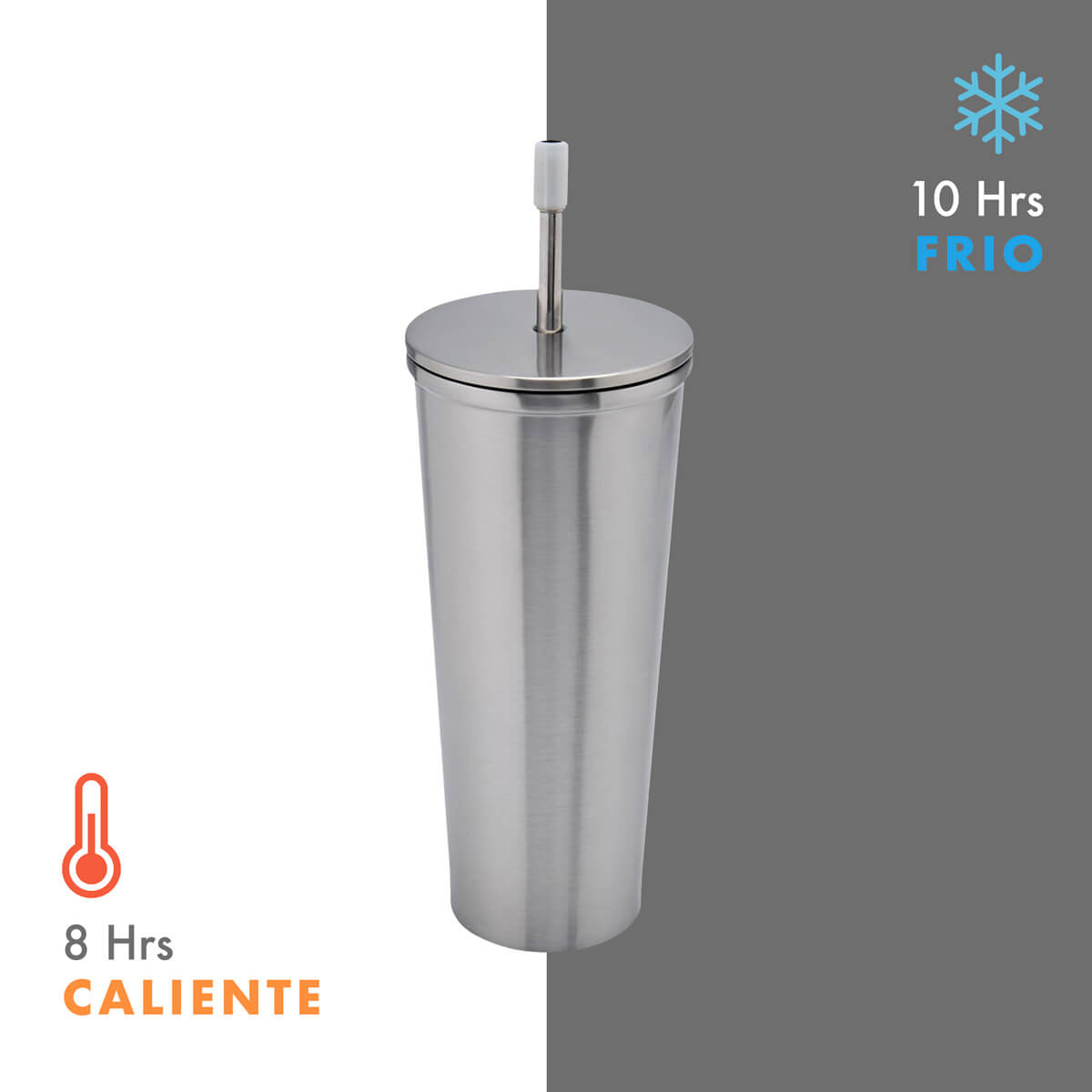 Doble pared. Cerrado al vacío. Pared interna y externa de acero inoxidable. Tapa de metal con plástico y cierre de rosca. Mantiene temperatura caliente 8 hrs y temperatura fría 10 hrs aproximadamente. Incluye popote metálico con boquilla de silicón. Caja individual incluida.